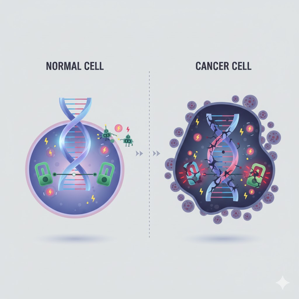 がんは、細胞のDNAに生じた「遺伝子の損傷(変異)」が時間とともに蓄積し、増殖のブレーキやアクセルの制御が壊れることで発生する病気である。加齢や生活習慣、環境要因、複製エラーなどが損傷の主要な原因で、通常は修復されるが、修復の失敗や破綻が重なると発がんにつながる。