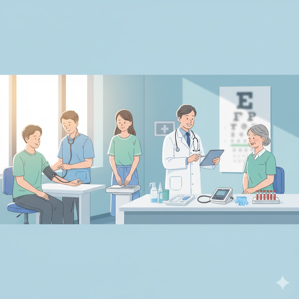 • 検査項目も、当初の身長・体重・視力・聴力・胸部X線・血圧・尿検査から、1989年以降は血液検査や心電図、1998年にはHDLコレステロールや血糖、2007年には腹囲・LDLコレステロールが追加され、生活習慣病の予防にも重点が置かれています。