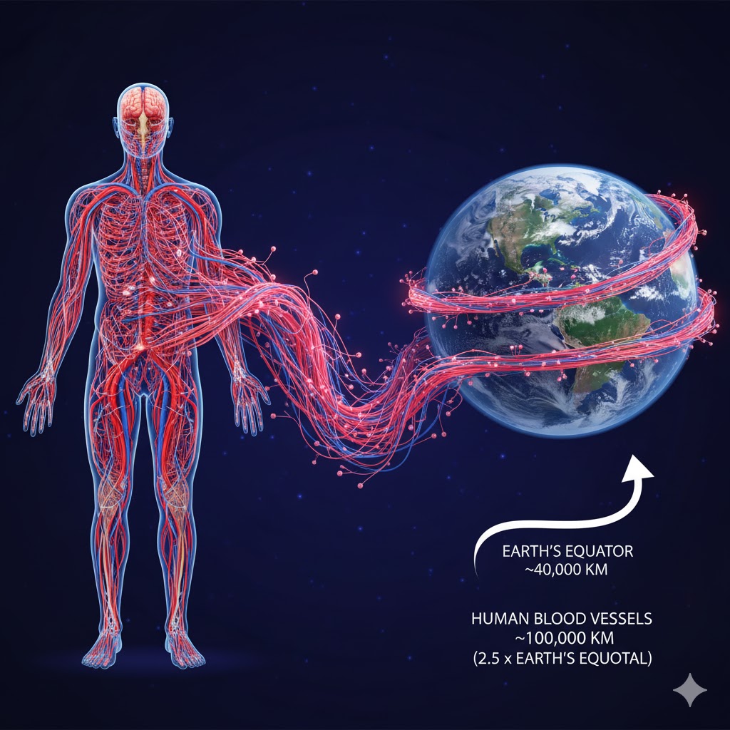 血管 Uncategorized X Facebook はてブ LINE コピー 2025.08.242025.11.16 人間の体内にある血管(動脈・静脈・毛細血管をすべて含む)の総延長は、成人で およそ10万km と言われます。 これは地球の赤道の長さ(約4万km)の約2.5倍に相当します。